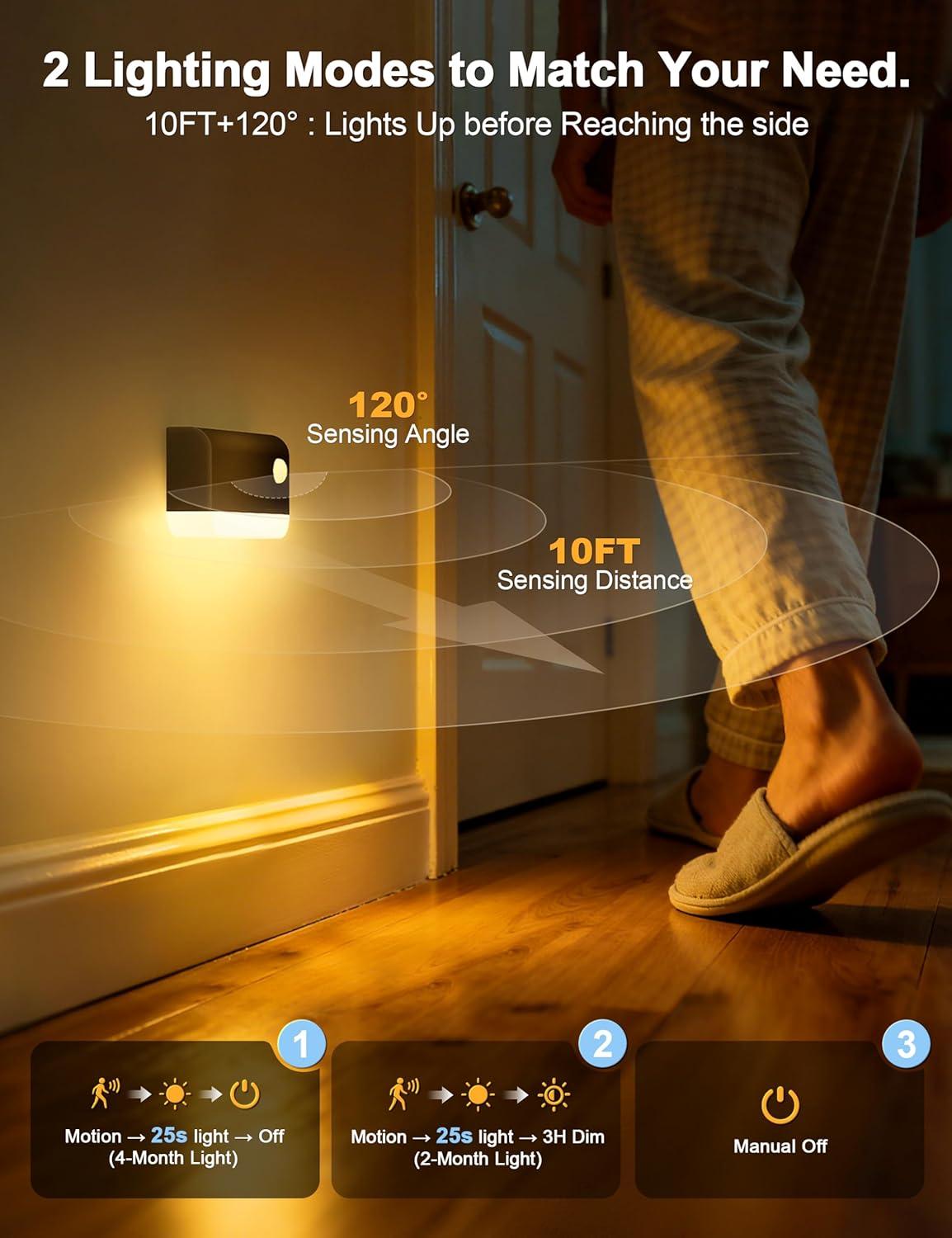 Versatile 3-in-1 Operation Modes: Choose from three smart modes for these motion stair lights indoor: Auto-On (activates for 25s upon motion), Dim Mode (25s bright light followed by 3 hours soft glow), or Off. These motion sensor night light adapt to various lighting scenarios effortlessly throughout the night