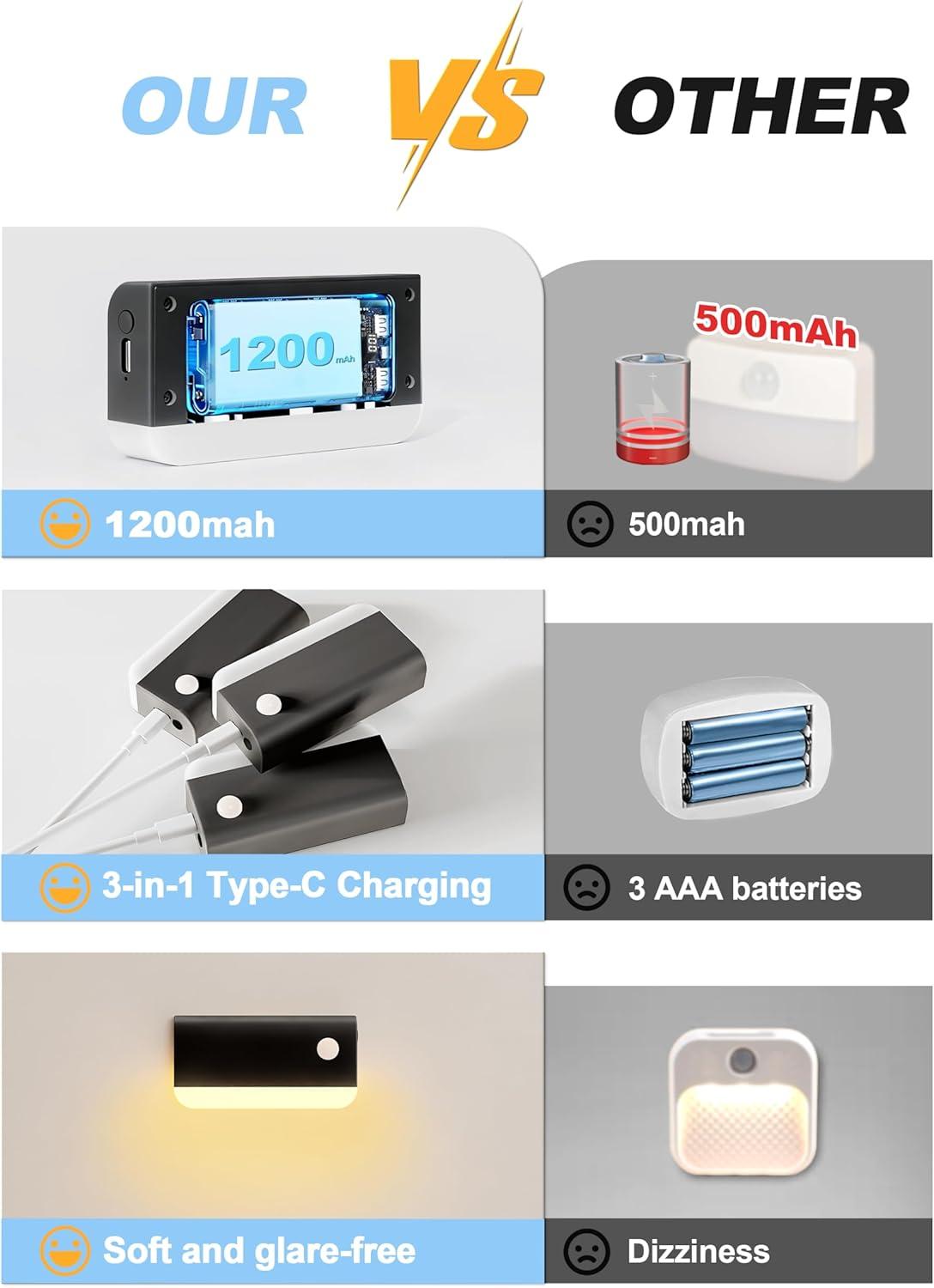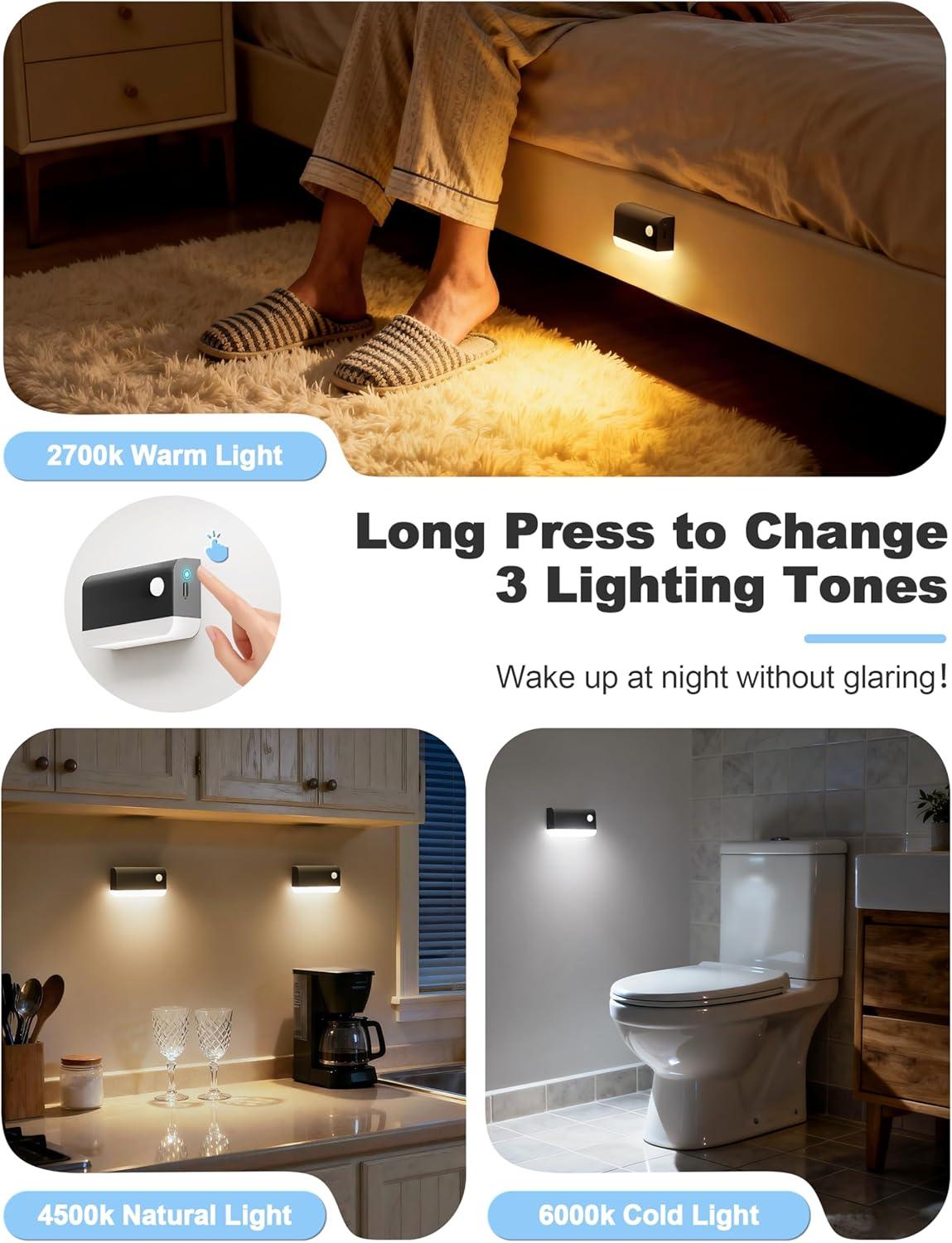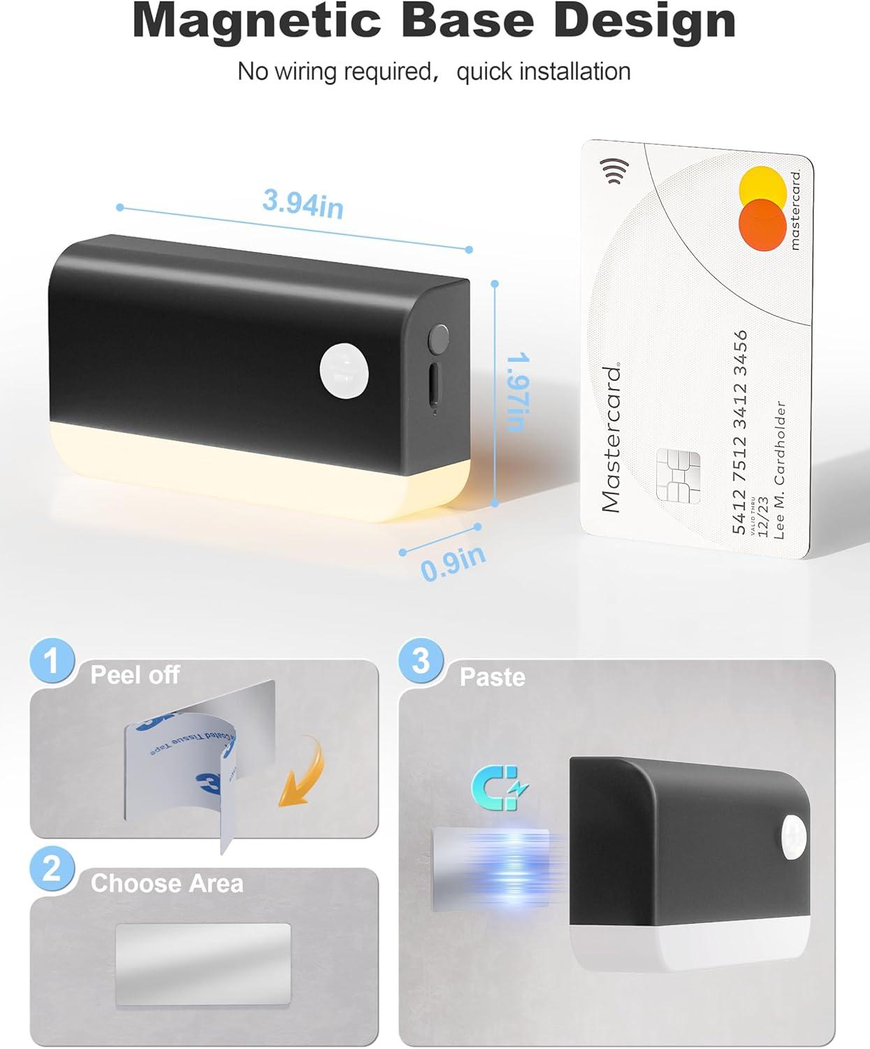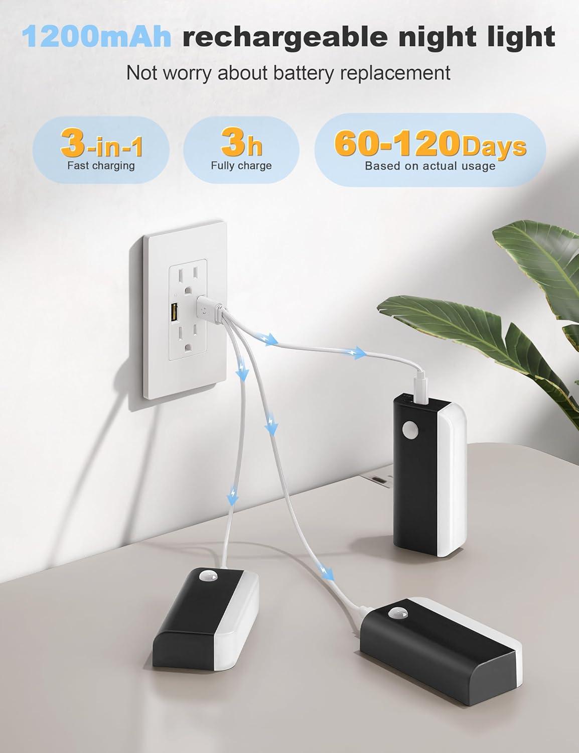 Long 4-Month Battery & Easy Install: The battery capacity is 1200mAh.Enjoy up to 4 months of use on a single charge with these motion sensor night lights. Features a strong magnetic base and adhesive sticker for quick, tool-free installation on most surfaces, making these motion sensor night light units easy to place and charge