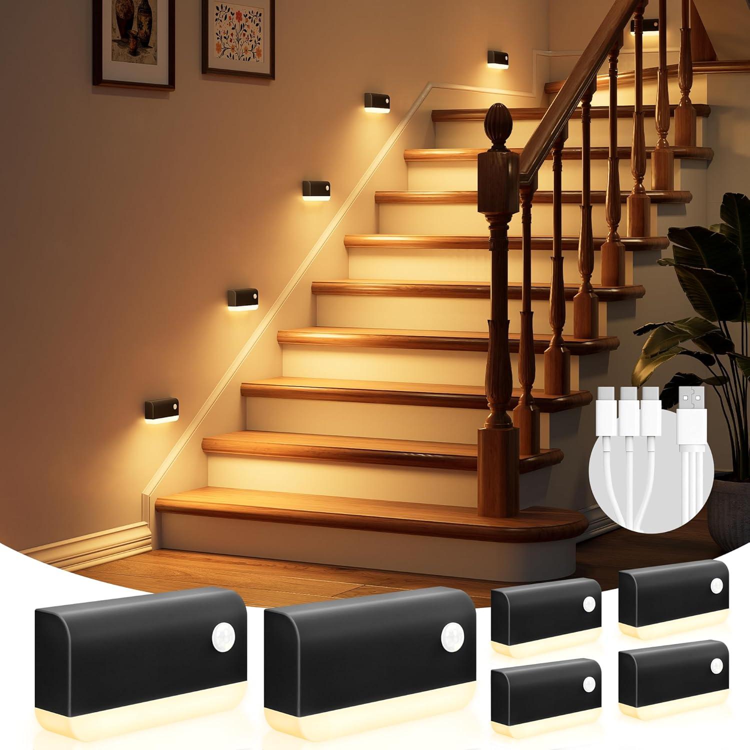 Enhanced Charging Capability (2 Cables): This 6-pack of motion sensor step lights comes with two 3-in-1 charging cables, allowing you to charge six motion sensor night lights for stairs simultaneously, solving the hassle of charging multiple units